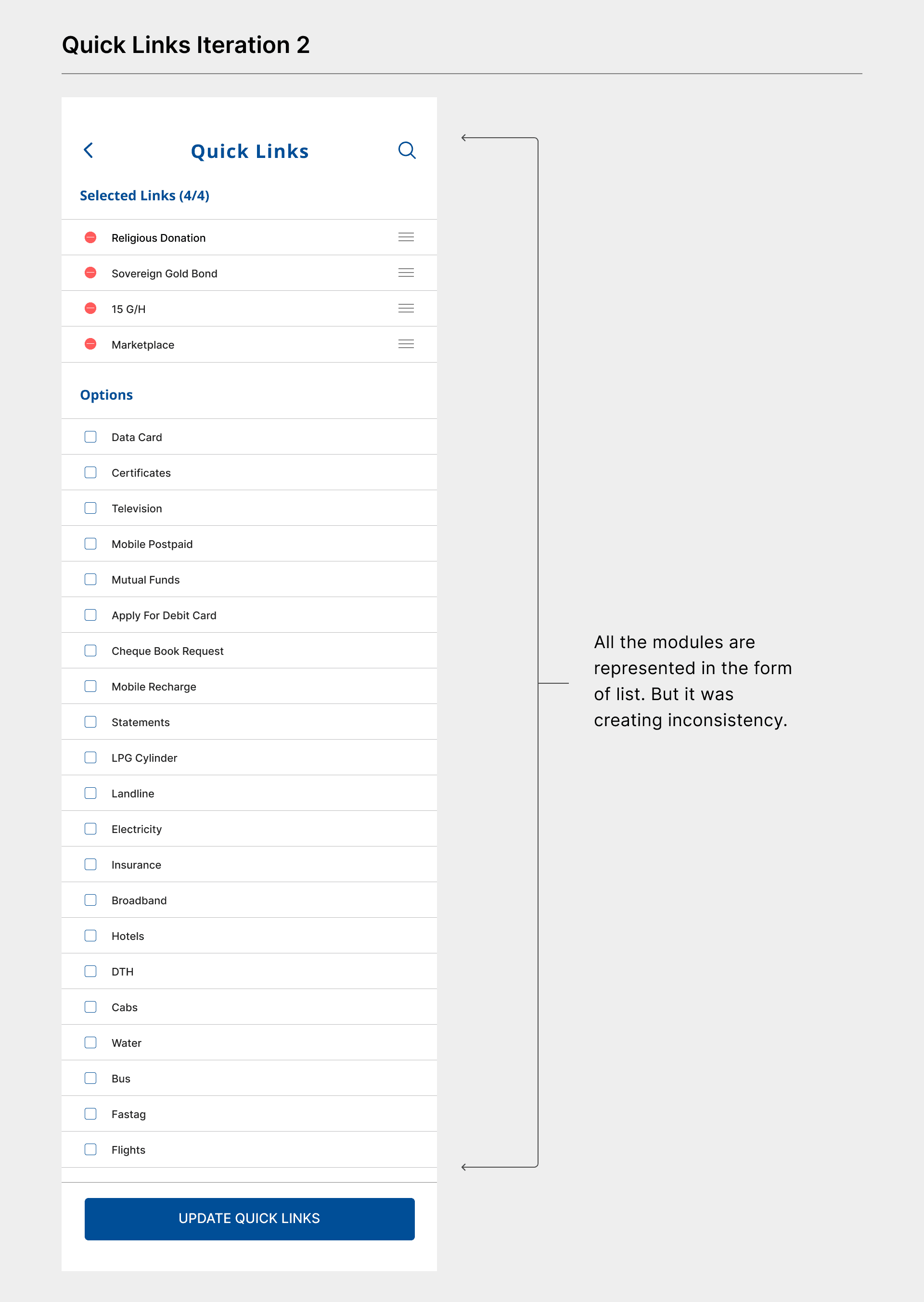 In this iteration, all the modules are represented in the form of list items. Users can select as many options as they want but they have to keep only 4 options else they won’t be able to proceed save. Additional option to sort the list items. I found one problem with the design, it is kind of inconsistency because we were using Cards and now this is a list.