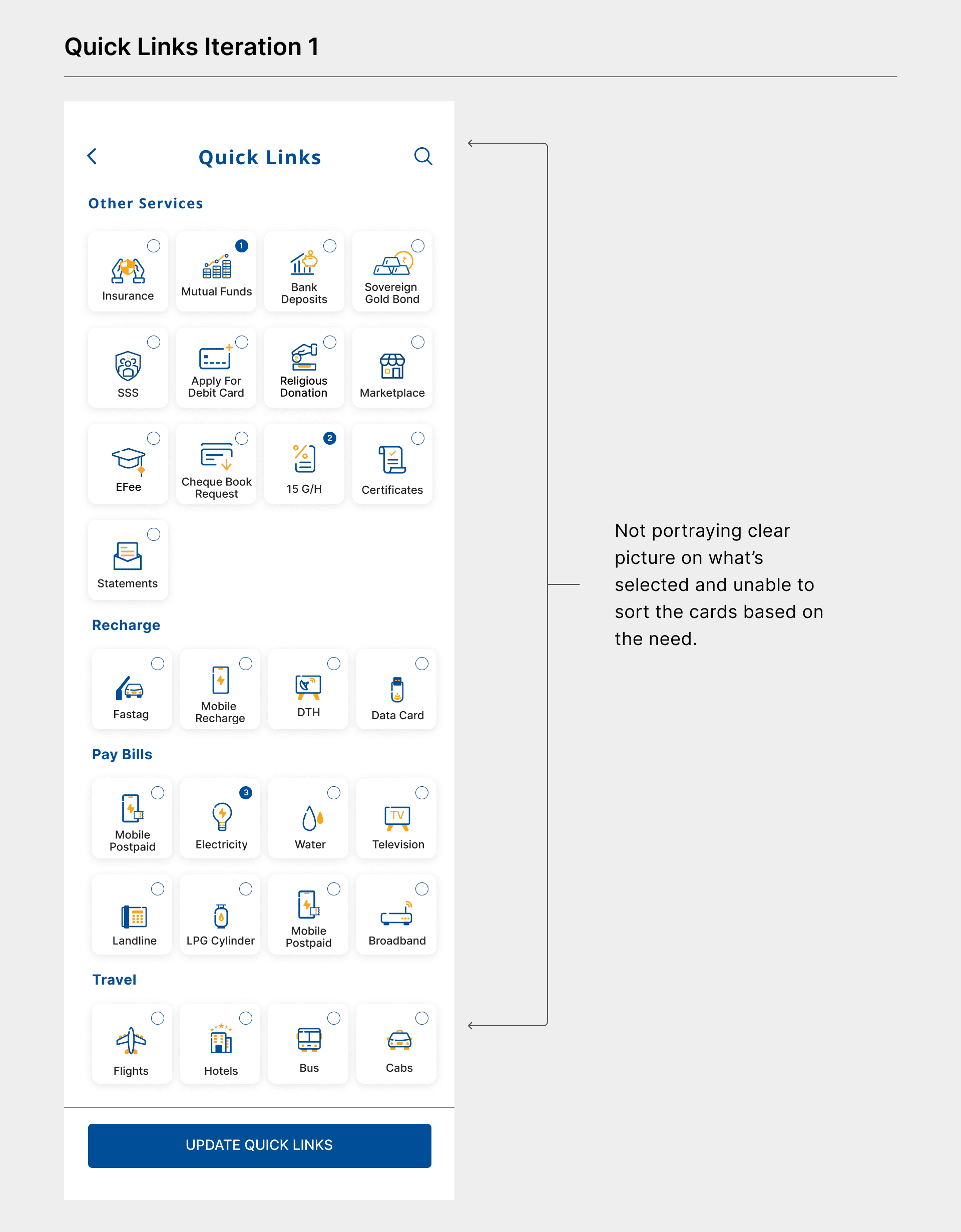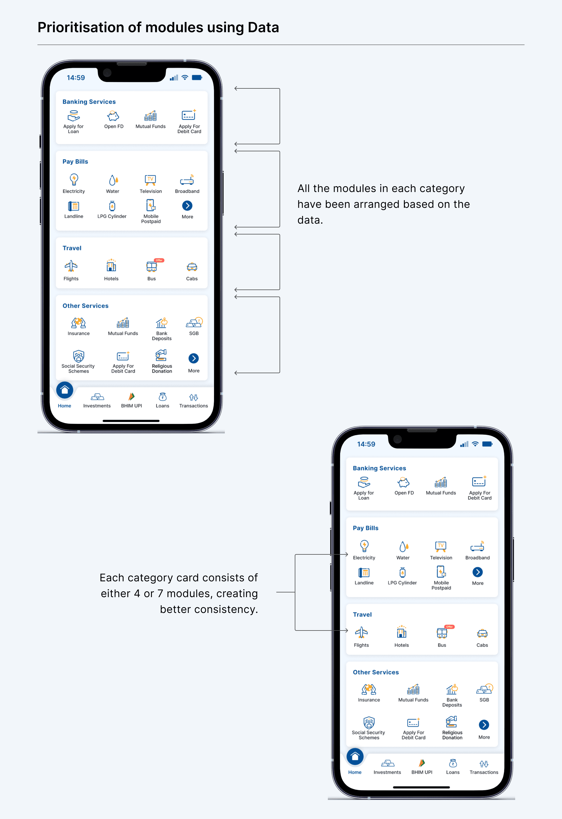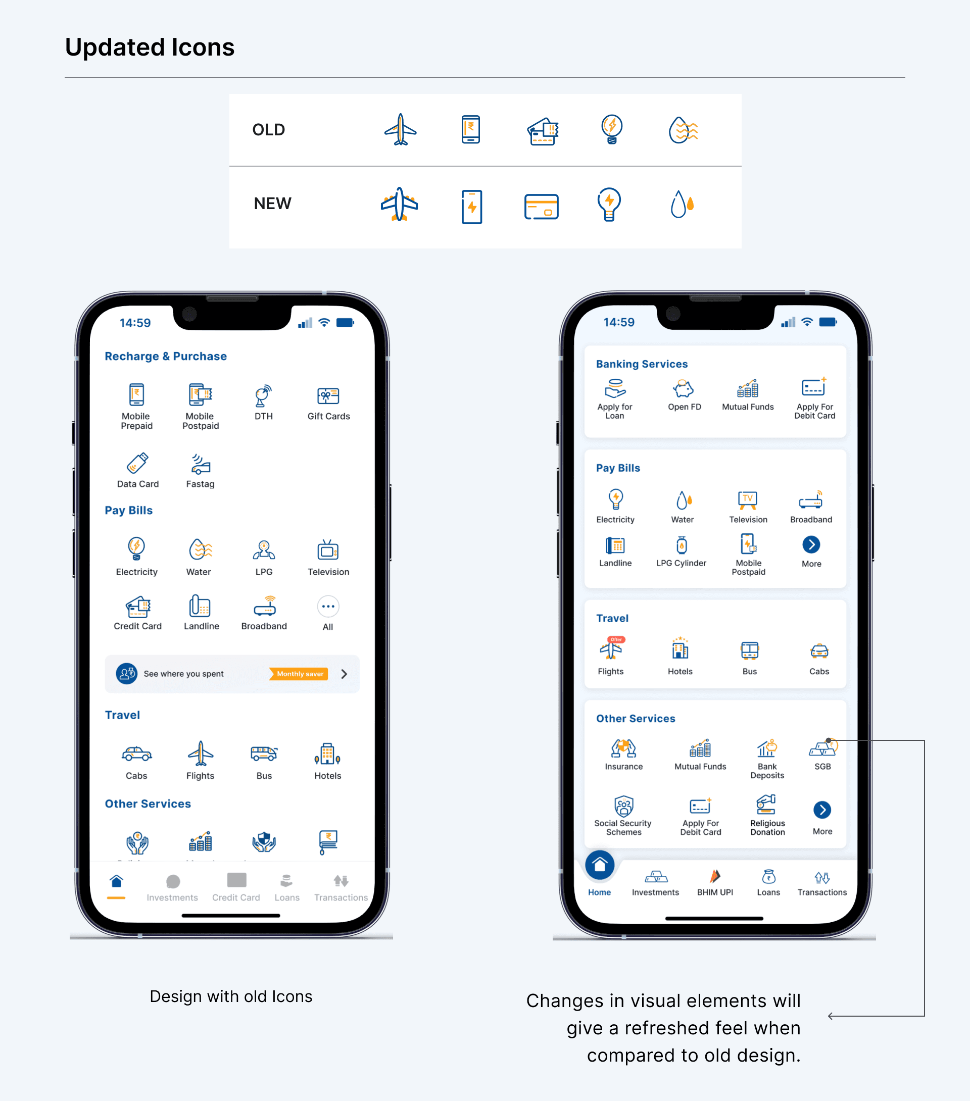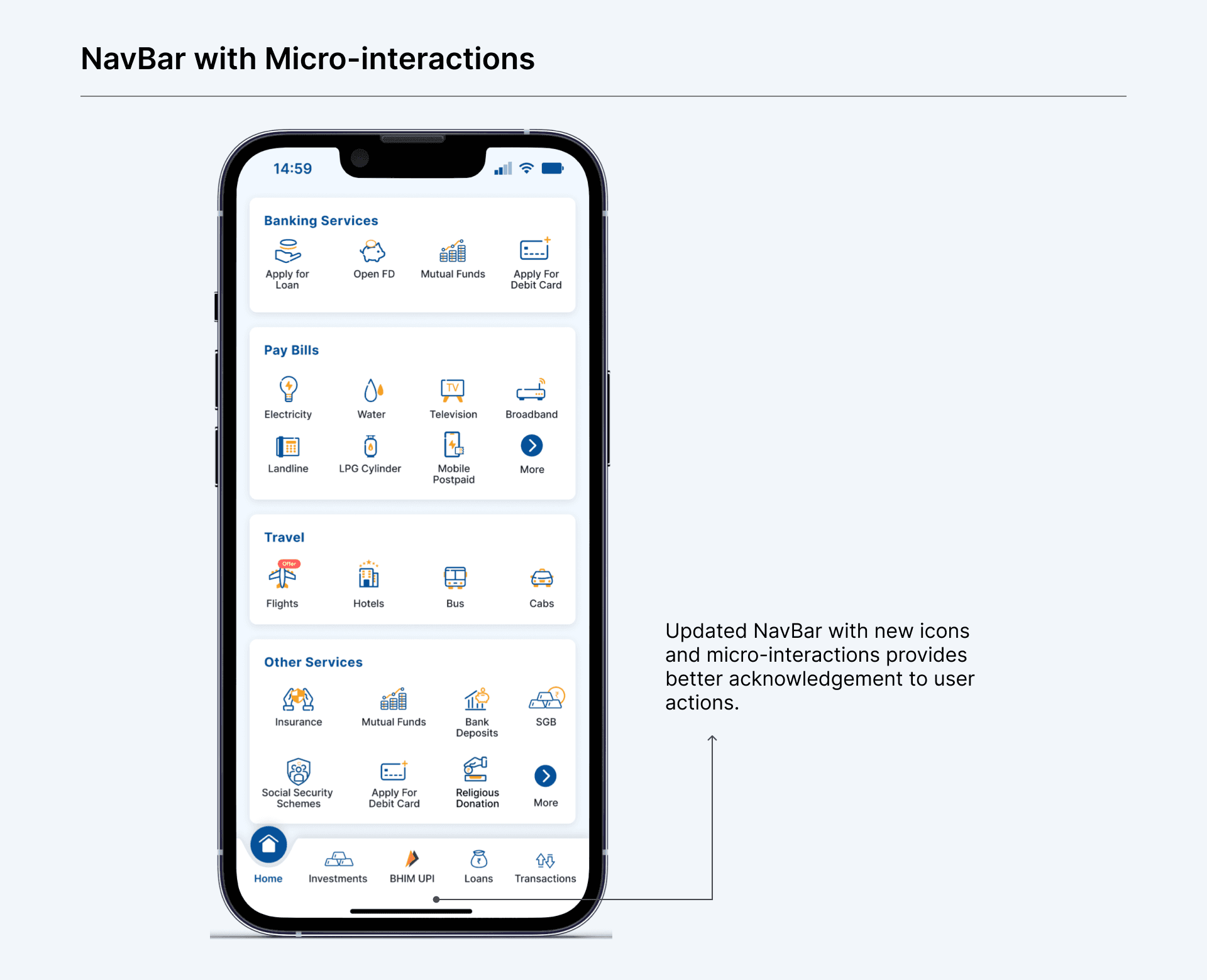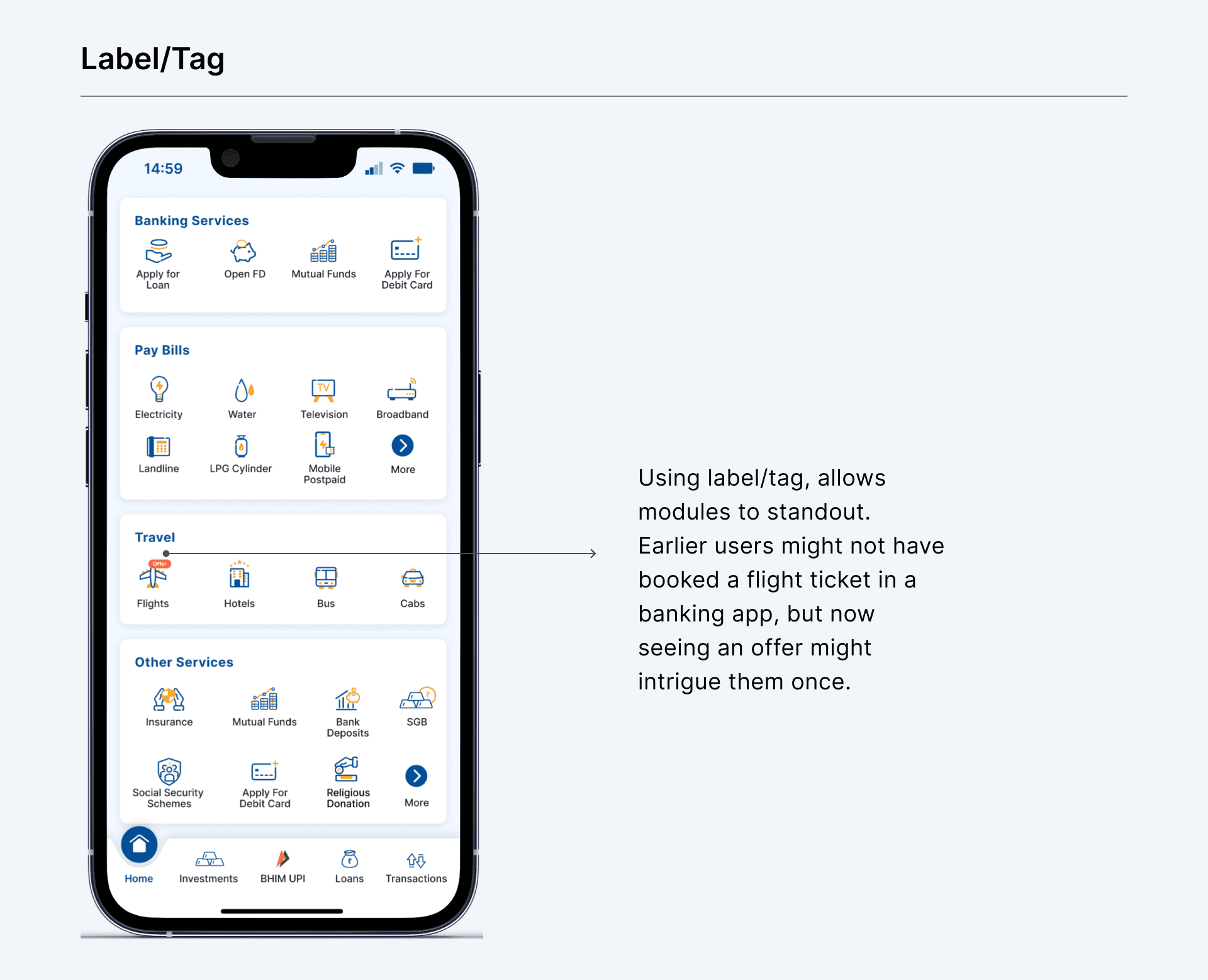 In the old design, there is no option to promote any particular module. This creates a gap between banks and users. The bank wants to promote a few modules but they can’t efficiently convey them. Banners might work but users generally miss out. Adding a label/tag on each module which the bank wants the user to interact with create differentiation. This allows users to engage with the rest of the modules which they generally don’t use and provides an opportunity for the users to see what offers are being rolled out for them.