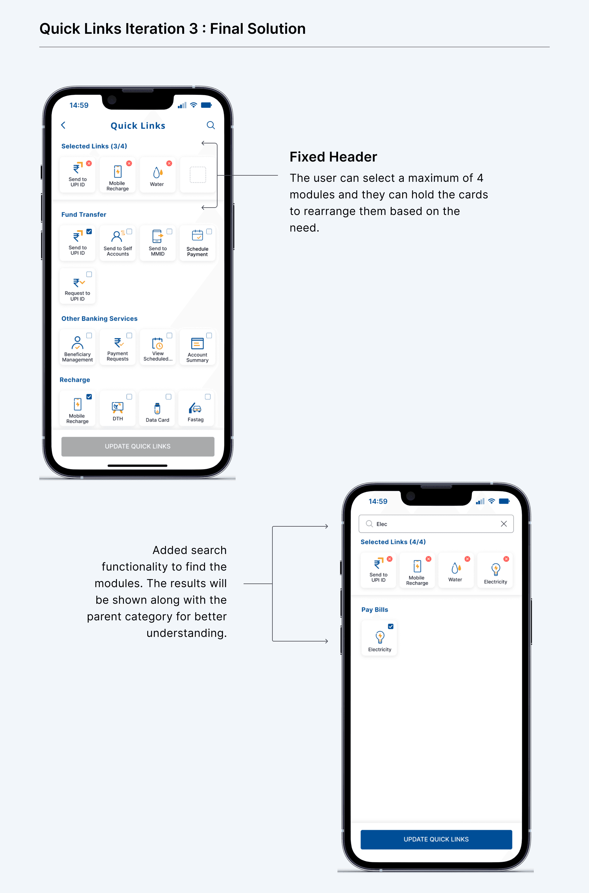 Final solutions: Search functionality, customizable Quick Links, prioritized banking services.