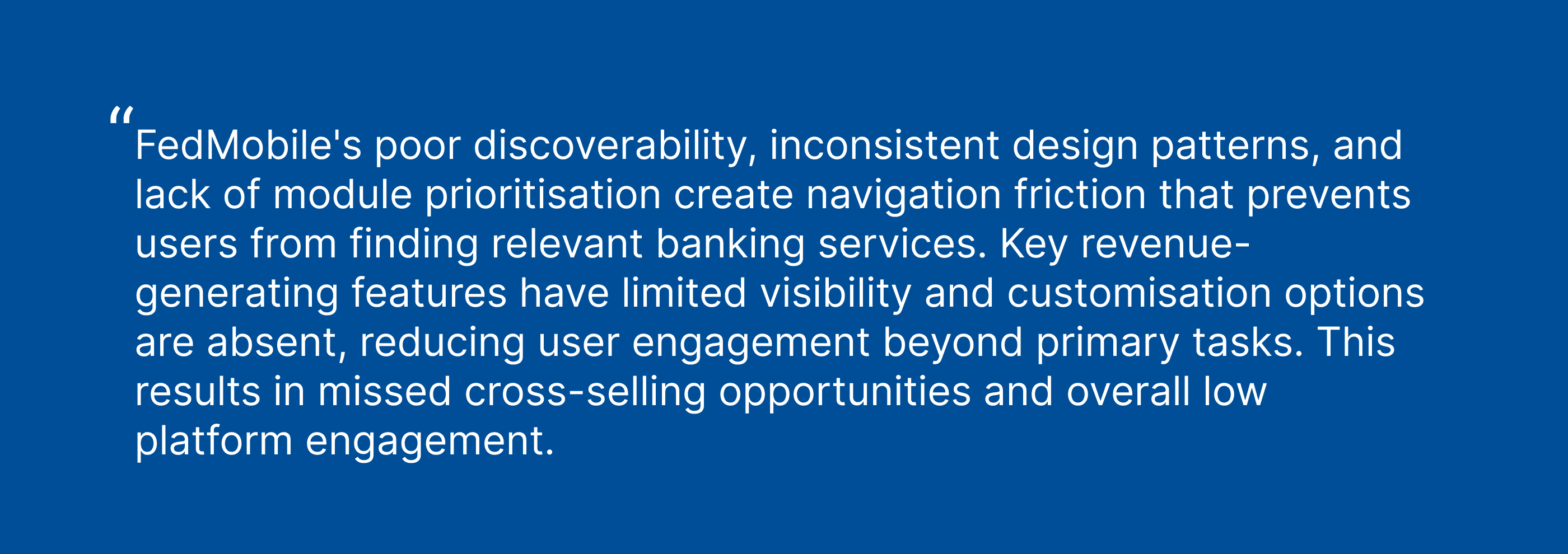 Users of FedMobile, a banking app with 19+ million customers, struggled with cluttered navigation, failed to discover features/modules and found unintuitive actions, leading to frustration and increased support requests for basic tasks. With 67% of banking services receiving less than 5% user engagement, Federal Bank was losing significant cross-selling opportunities and revenue potential from the existing UX.