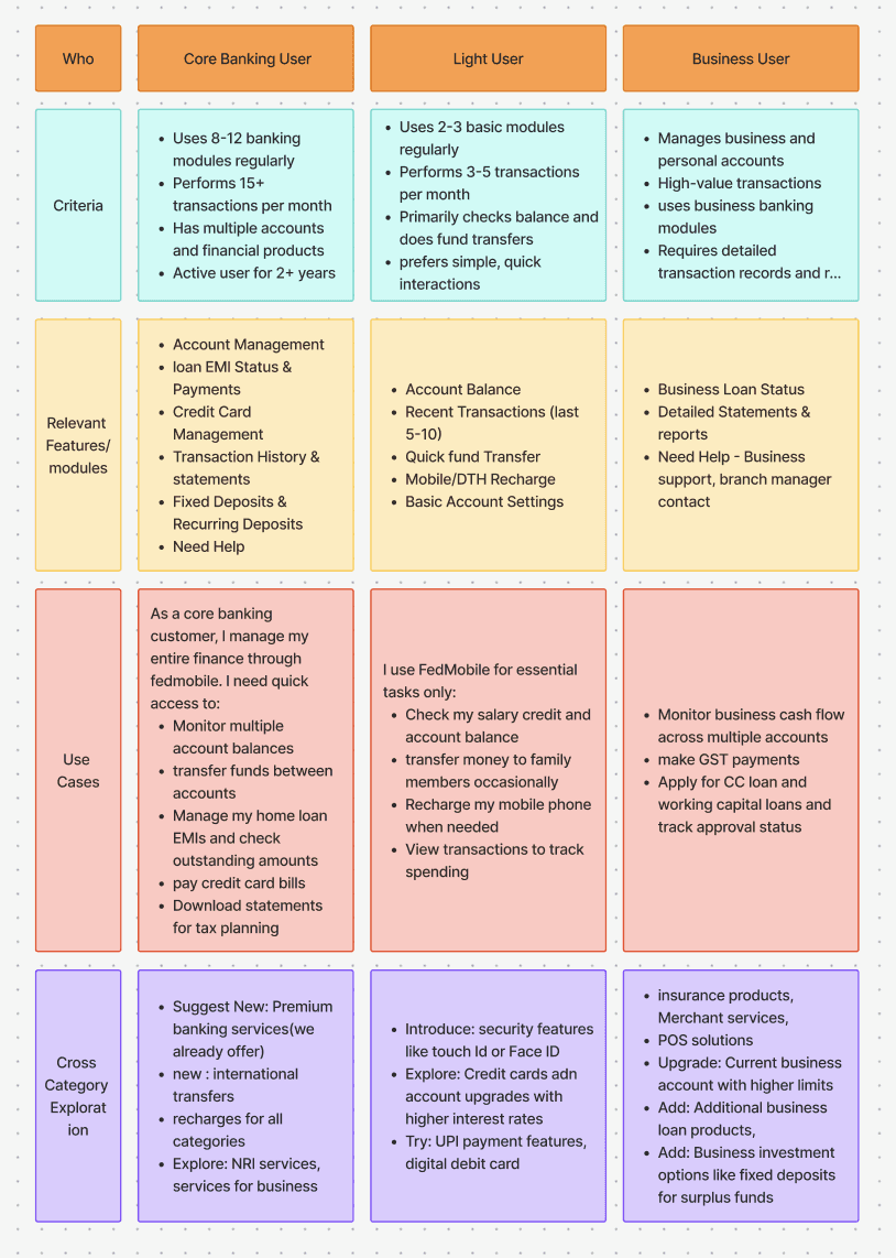 With quantitative data in hand, I wanted to understand behavioral patterns of the users and also to understand why a person is FedMobile and for what purpose. Banking industry have regulations to limit direct access to users, however, I managed to conduct some much-needed user interviews followed by structured questionnaires and recording of activities.